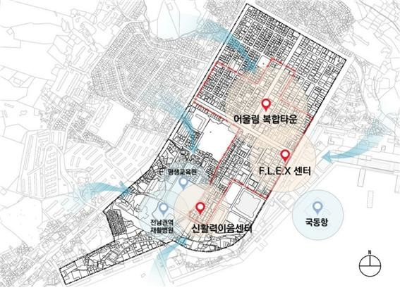 공유오피스‧시제품제작실 등 창업지원공간인 ‘FLEX센터’와 공유주방‧음식개발 등 주민소득창출공간인 ‘신활력이음센터’, FLEX문화거리가 조성되고, 주민역량강화사업, 마을공동체 육성 및 일자리 창출 등 지속 가능한 도시재생이 추진된다.