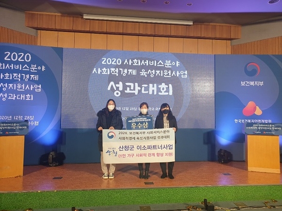 경남 산청군은 보건복지부가 주관한 '2020년 사회서비스 분야 사회적경제 육성지원사업' 성과평가에서 우수기관에 선정됐다고 29일 밝혔다.