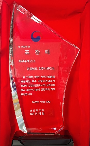 경남 진주시 보건소는 보건복지부에서 실시한 지역사회중심 재활사업 평가에서 최우수 기관, 최우수 사업 유공자 부분과 더불어 최우수 민간 협력사업 유공자 부분까지 총 3개 분야에서 복지부 장관 표창을 휩쓰는 영광을 안았다고 31일 밝혔다.