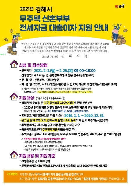 '무주택 신혼부부 전세자금 대출이자 지원 사업'은 ▲공고일(8일) 현재 부부 모두 김해시에 거주 ▲혼인 신고일 기준 5년 이내(2016.1.1.~2020.12.31.) ▲기준중위소득 180% 이하 ▲최초 전세자금 대출금 1억 5천만원 이하인 신혼부부들을 대상으로 한다.
