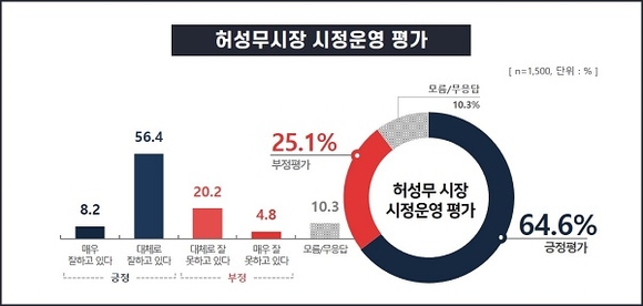 창원시가 전문여론조사기관에 의뢰해 실시한 창원시 시정만족도 조사 결과에서 응답자 전체 64.6%가 허성무 시장의 시정운영에 대해 '잘하고 있다'고 평가했으며, 2018년 53.3%, 2019년 57.0% 긍정평가가 출범 3년 차를 맞아 11.3%p 상승했다.