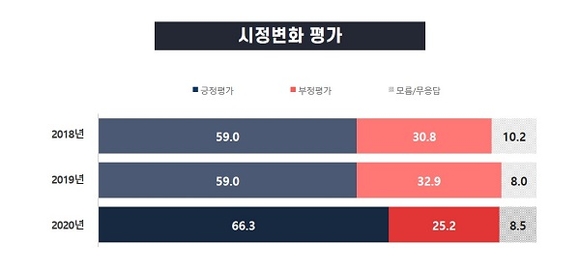 '사람중심 새로운 창원'이라는 시정 변화에 대해서는 창원시민 66.3%가 '잘하고 있다'고 평가했다. 이는 `18년 여론조사(59.0%)때보다 7.3%p 상승한 수치다.