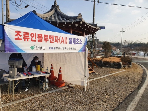 군은 지난 13일 발생농가 접경지역인 단성면 관정리에 고병원성 AI 유입 방지를 위한 통제초소를 설치했다.