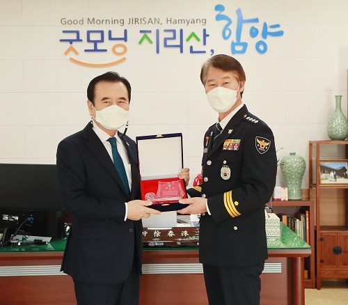 서춘수 함양군수가 15일 오전 군수실에서 함양경찰서로부터 읍내파출소 이전에 따른 감사패를 받았다.
