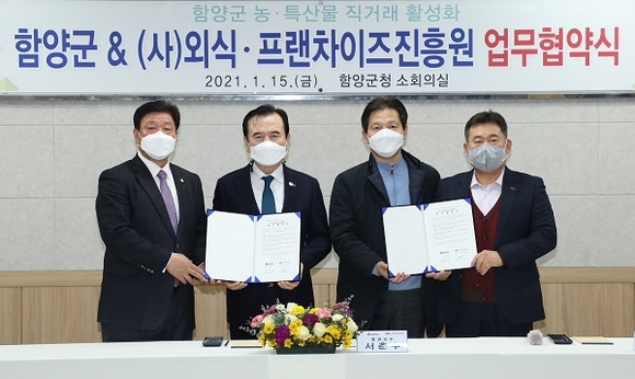 경남 함양군은 15일 오후 군청 소회의실에서 서춘수 함양군수와 (사)외식·프랜차이즈진흥원 서민교 원장 등 관계자들이 참석한 가운데 함양군 농·특산물 직거래 활성화를 위한 업무협약을 체결했다.