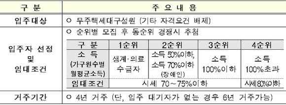 임대조건은 시중 전세 시세의 70~80% 이하 수준이며, 기본 임대조건의 80%를 임대보증금으로, 나머지 20%를 월임대료로 납부해 입주자들의 주거비 부담을 줄이는데 도움이 될 전망이다.