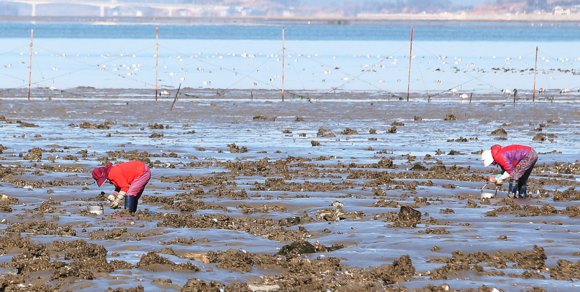 19일 오전 전남 함평군 돌머리해수욕장에서 석두마을 어촌계 아낙들이 제철을 맞아 살이 통통하게 오른 석화(굴)를 채취하고 있다.