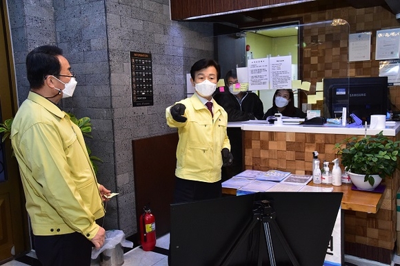 조규일 진주시장이 21일 오후 진주시가 코로나19 확산방지 시책으로 운영하고 있는 '안전숙소'를 방문해 시설 및 운영 상황을 점검했다.