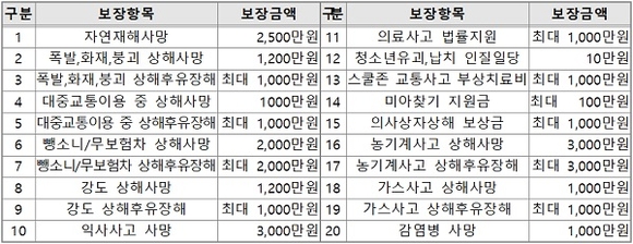 거창군 군민안전보험은 2019년부터 민선7기 군수 공약사업으로 추진됐으며, 작년 한해에만 12건에 2억 3천만원의 보험금이 군민에게 지급됐다. 올해 가입된 보장항목은 아래 표를 참고하면 된다.