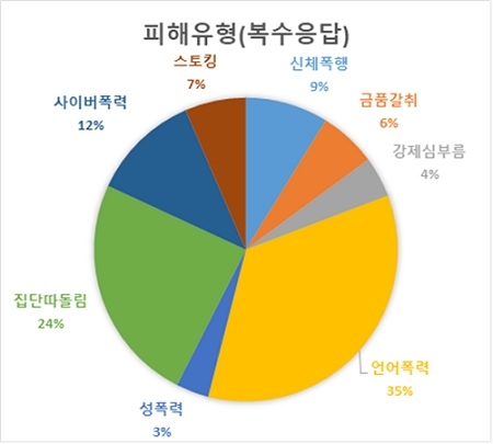 피해유형별로는 전체 피해응답자 1944명 중 중 언어폭력이 34.8%로 가장 높았고, 집단따돌림(24.4%), 사이버폭력(11.6%), 신체폭행(8.8%), 스토킹(6.5%), 금품갈취(6.1%), 강요(4.3%), 성폭력(3.5%) 순으로 나타났다.