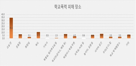 피해 경험 장소로는 교실 안(35.1%), 복도(11.3%), 사이버공간(8.2%), 급식소 및 매점(7.8%) 등의 순으로 발생했다. 피해 경험 시간은 쉬는 시간(40.3%), 점심시간(14.5%), 하교 이후(14.4%), 기타(10.5%) 등의 순으로 나타났다.