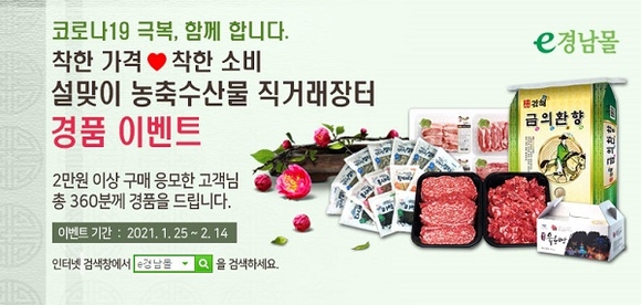 경남도는 코로나19 재확산으로 판매에 어려움을 겪고 있는 농축수산물 판로 확대를 위해 경남도 농특산물 쇼핑몰 'e경남몰'에서 오는 25일부터 2월 14일까지 설명절 특별 온라인 특판전을 진행한다.