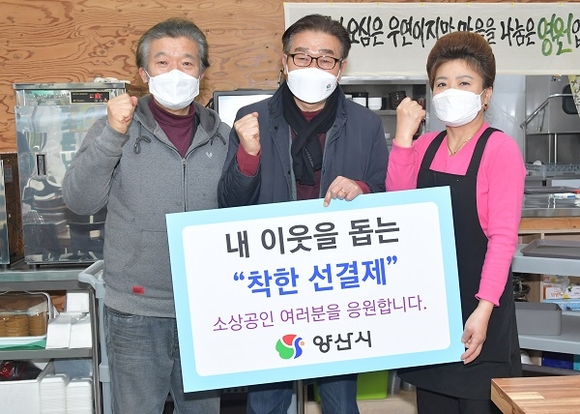 김일권 양산시장이 22일 코로나19로 사회적 거리두기 강화와 5인 이상 집합금지 장기화로 어려움을 겪고 있는 소상공인을 돕기 위해 '착한 선결제 캠페인'에 동참했다.