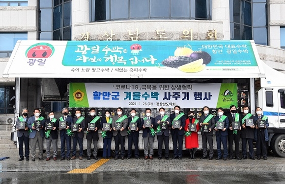 경남도의회는 26일 도의회 광장에서 '함안 겨울 수박 사주기' 행사를 가졌다.
