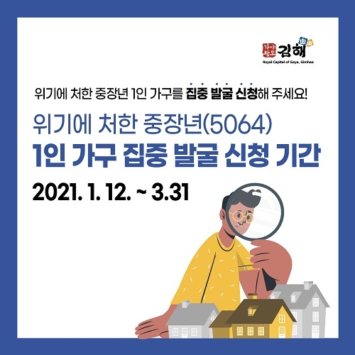 경남 김해시는 지난 12일부터 3월 말까지 위기에 처한 중장년(50~64세) 1인 가구 집중 발굴·신청 기간을 운영한다고 27일 밝혔다.