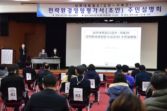 26일 진주시청 시민홀에서 남부내륙고속철도(서부경남KTX) 전략환경영향평가서(초안) 주민설명회가 열렸다.