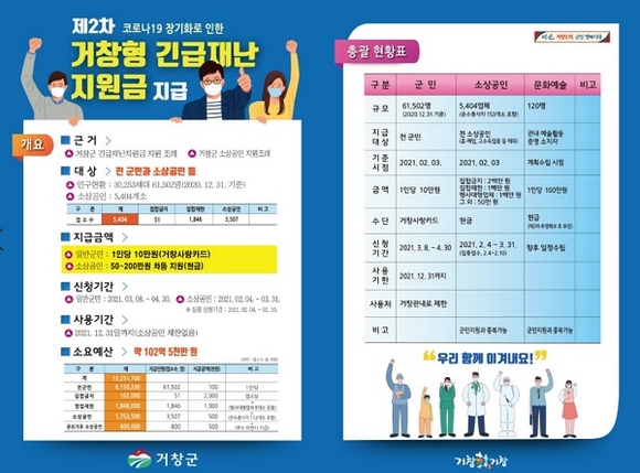 재난지원금은 ▲거창형 긴급재난지원금 ▲거창형 소상공인 긴급재난지원금 ▲거창형 문화예술인 긴급재난지원금으로 구분해 지급된다.