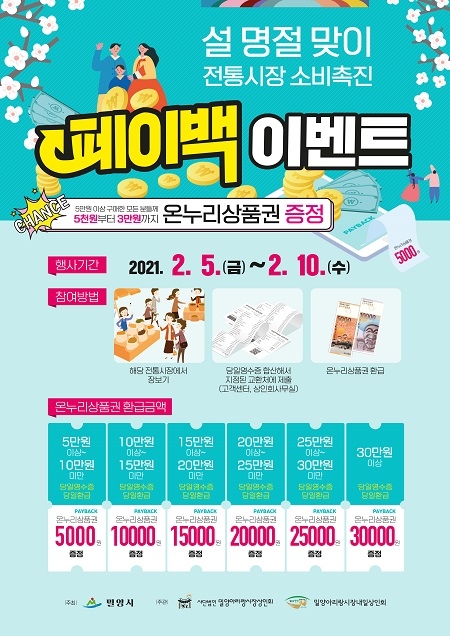 경남 밀양시는 코로나19로 침체된 전통시장 살리기의 일환으로 밀양아리랑시장에서 5일부터 10일까지 '설 명절맞이 전통시장 소비촉진 페이백 이벤트'를 개최한다고 밝혔다.