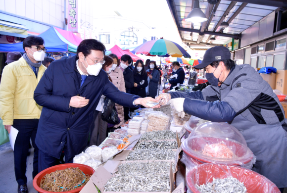 이용섭 시장은 첫 행선지로 코로나19로 이용객 감소 등 피해를 겪고 있는 광산구 송정매일시장과 송정5일시장을 찾아 설맞이 전통시장 장보기를 전개하고 상인들의 애로사항을 청취했다.