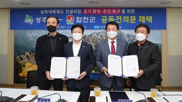 한편 경남·경북의 상생발전 및 국가균형 발전의 밑거름이 될 남부내륙철도 조기추진을 위해 뜻을 모은 합천군과 성주군은 이날 채택한 공동건의문을 빠른 시일 내 국토부를 방문해 전달하기로 했다.