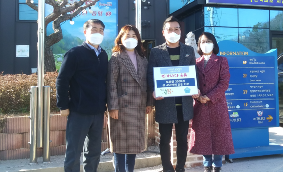 코로나 19 여파로 어려운을 겪고 있는 가운데 ㈜가나다(대표 최정학)가 지난 9일 돌봄 이웃에게 전해 달라며 생닭 300마리를 광산구 송정1동 행정복지센터에 기부했다. 최정학 대표는 “코로나19로 인한 경제적 위축 상황에서 작지만 어려움을 함께 나눠 훈훈한 지역사회 분위기를 돌파할 계기를 마련하고 싶었다”고 말했다. ㈜가나다 최정학 대표는 매년 복지시설 등에 토종닭과 삼계닭 수천마리씩을 기탁하고 있다.