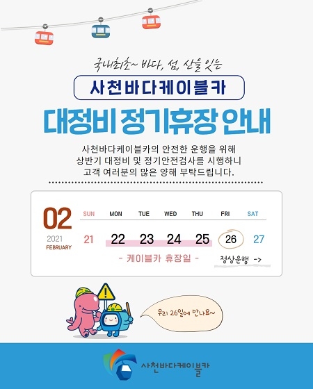 사천시시설관리공단은 사천바다케이블카 상반기 대정비와 정기 안전검사를 위해 오는 22일부터 25일까지 휴장한다고 15일 밝혔다.