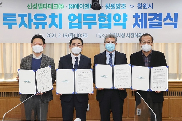 경남 창원시는 16일 오전 시정회의실에서 신성델타테크㈜, ㈜에이엔테크, 농업회사법인 창원양조 등 3개사와 투자금액 357억원, 신규고용 261명 규모의 투자협약을 체결했다고 밝혔다.