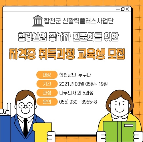 경남 합천군 농촌신활력플러스사업추진단은 힐링산업 종사자 전문화를 위한 자격취득 교육과정을 마련하고 이달 5일부터 교육생을 모집하고 있다.