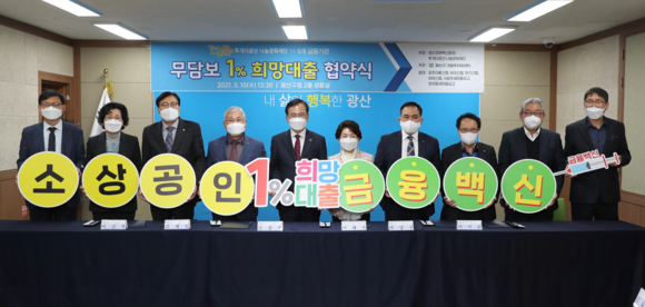 광주 광산구(구청장 김삼호)는 “광주어룡신협, 우신신협, 비아신협, 서광주새마을금고, 한마음새마을금고와 투게더광산나눔문화재단은 10일 오후 구청 상황실에서 ‘무담보 1% 희망대출’ 업무 협약식을 개최했다”고 밝혔다.