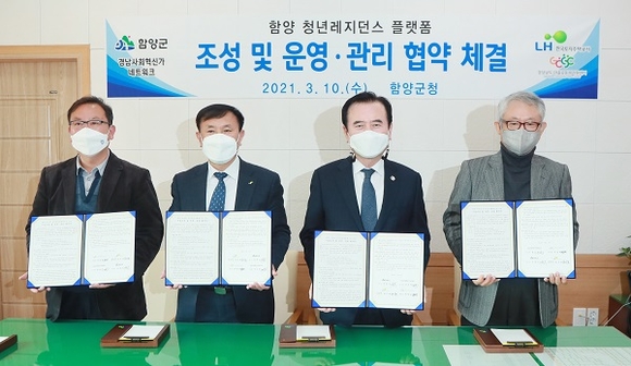 군에 따르면 10일 오전 군수실에서 서춘수 함양군수, 하승호 한국토지주택공사(LH) 경남지역본부장, 정보주 (사)경남사회혁신가네트워크 이사장, 박영태 경남마을공체지원센터장 등이 참석한 가운데 시설물 조성 및 운영 등을 위한 업무협약을 체결했다.