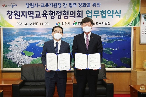 창원시와 창원교육지원청은 12일 오전 시청 접견실에서 허성무 시장과 정우석 교육장 등이 참석한 가운데 업무협약을 체결하고, 시 교육행정에 관한 공조체계를 구축해 향후 긴밀히 협력키로 했다.