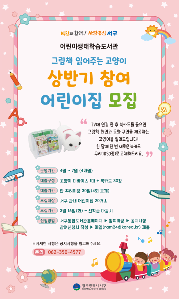 광주 서구(구청장 서대석) 어린이생태학습도서관이 관내 어린이집 40개소를 대상으로 ‘그림책 읽어주는 고양이’를 운영한다.