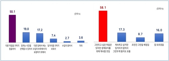 특히 플랫폼 종사자의 4대 사회보험 미가입 응답률은 79.3%로 사회안전망에 취약할 뿐아니라 산재보험 미가입자의 88.3%는 사고발생시 재해처리비용을 전적으로 본인이 부담하는 것으로 나타났다. 이 밖에도 최근 언론에서 보도되는 것처럼 직업에 대한 낮은 사회적 평판과 갑질문제 등 부당대우, 일의 빈도 예측불가에 따른 생계불안 등으로 플랫폼 종사자의 88.6%는 사회안전망이 보장되는 근로기준법 적용 노동자를 희망하는 것으로 분석했다.