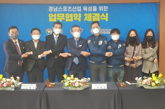 경남도는 19일 마산대학교에서 마산대, NC 다이노스와 지속 가능한 경남 스포츠산업 육성을 위한 3자간 업무협약을 체결했다.