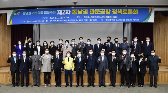 동남권 9개 기초의회(부산 사상구·북구·강서구, 울산 중구·북구·울주군, 김해시, 거제시, 양산시)는 지난 22일 김해중소기업비즈니스센터 대회의장에서 제2차 동남권 관문공항 정책토론회를 가졌다.