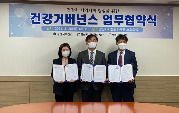 경남 양산시보건소는 건강한 지역사회 형성을 위해 25일 양산시시설관리공단 본부 소회의실에서 시설관리공단, 시체육회와 업무협약을 체결했다.