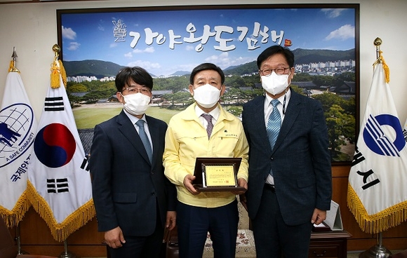허성곤 김해시장이 남해고속도로 진영(부산)복합휴게소 건설공사에 기여한 공로를 인정받아 26일 한국도로공사로부터 감사패를 전달받았다.
