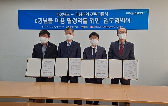 경남도와 한국전력공사 경남본부, 한국남부발전 하동발전본부, 한국남동발전 삼천포발전본부 등 경남지역 전력그룹 3개사는 29일 오후 도청에서 e경남몰 이용 활성화를 위한 업무협약을 체결했다.