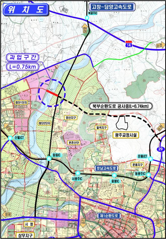 광주광역시는 대촌교차로부터 빛고을대로 용두교차로 하부까지 총 길이 0.75㎞의 6차선 도로개설이 지난 3월15일 완료돼 2일 오전 9시에 정식 개통한다.