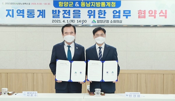 경남 함양군은 1일 군청 소회의실에서 서춘수 군수와 민경삼 동남지방통계청장 등 10여명이 참석한 가운데 함양군과 통계청간 지역통계 개발을 위한 협약식을 가졌다.