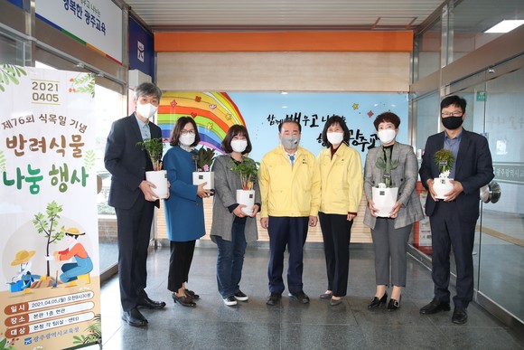 광주시교육청이 5일 제76회 식목일을 맞아 탄소중립 실현, 녹색환경 구축, 화훼 소비 촉진, 직원 간 소통 강화 및 정서적 안정 도모를 위해 ‘공기정화 반려식물 나눔 행사’를 개최했다.