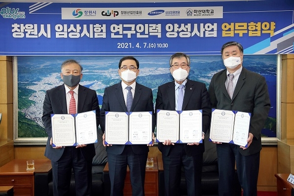 경남 창원시는 7일 오전 접견실에서 '창원시 임상시험 연구인력 양성사업'의 원활한 추진과 지역 인재 양성 및 일자리 창출에 기여하기 위해 삼성창원병원 및 마산대학교와 업무협약을 체결했다.