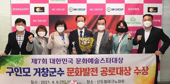 경남 거창군은 구인모 군수가 대한민국 예술문화 스타대상 조직위원회에서 주최한 '제7회 대한민국 예술문화 스타대상 시상식'에서 문화발전 공로대상을 수상했다고 7일 밝혔다.