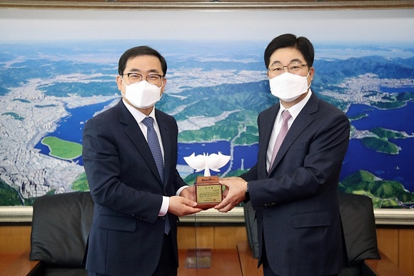 경남 창원시는 7일 오전 시청 접견실에서 지난달 퇴임한 황윤철 전 BNK경남은행장에게 그동안의 고마운 마음을 담아 감사패를 전달했다.
