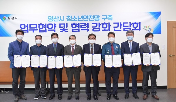 경남 양산시는 지난 7일 시청에서 양산경찰서, 양산교육지원청, 양산부산대학교병원, 부산고용노동청양산지청, 울산보호관찰소, 울산청소년비행예방센터, 경남도일시청소년쉼터 등과 시 청소년안전망 구축 업무협약 및 협력 강화 간담회를 가졌다.