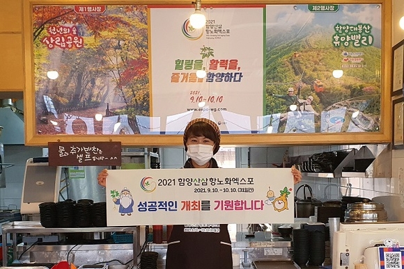 '2021 함양산삼항노화엑스포' 알리기에 함양군 관내 음식점이 자발적으로 동참해 눈길을 끌고 있다.