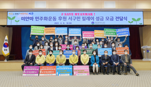 특히, 지난달 10일을 시작으로 ▲서구청 직원 ▲서구의회 ▲서광회 ▲ 18개 동 자생단체 ▲서구마을네트워크 ‘이락’ 등 미얀마의 봄을 응원하는 서구 시민·기관·단체·직원들의 성금 릴레이 후원이 줄을 이었다.