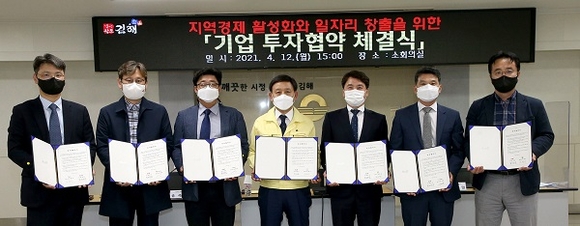 경남 김해시는 12일 시청 소회의실에서 국내 우수기업 6개사와 2374억 원의 대규모 투자협약을 체결했다.