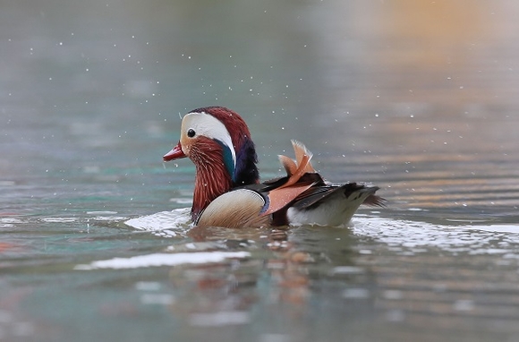 봄비가 내린 12일 경남 함양군 천연의 숲 상림공원 연밭에서 천연기념물 제327호인 원앙이 물놀이를 즐기고 있다. (사진=함양군 제공)