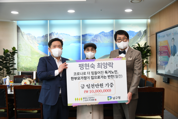연예계 잉꼬 부부인 팽현숙‧최양락씨가 광주 남구 관내 독거노인의 끼니 걱정을 덜어주기 위해 착한 후원에 나섰다.